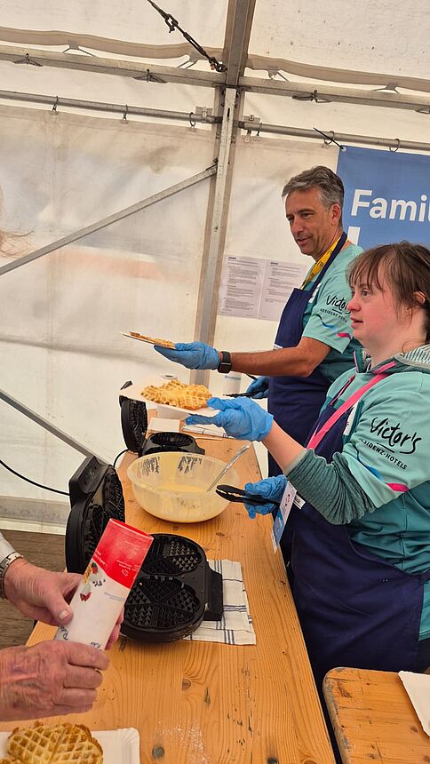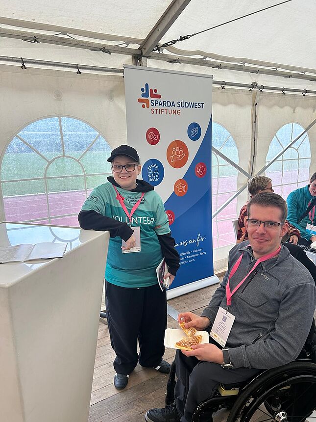 Insgesamt 15 Volunteers aus unseren Teams unterstützten gemeinsam mit dem Johannes-Kepler-Gymnasium und der Ruth-Schaumann-Schule die SpardaLounge der Sparda-Bank. Dort sorgten sie mit Kaffee, Waffeln, Rostwürsten und bei den inklusiven Mitmachspielen wie Boccia oder Sacklochwerfen für beste Stimmung.